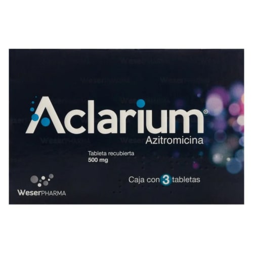 ACLARIUM 500 mg Tableta (azitromicina) es un antibiótico macrólido de amplio espectro indicado en el tratamiento de infecciones bacterianas causadas por microorganismos sensibles a su acción. Está autorizado para su uso en el abordaje de diferentes infecciones del tracto respiratorio superior e inferior, como faringitis, amigdalitis, sinusitis, bronquitis y neumonía adquirida en la comunidad, así como en infecciones de piel y tejidos blandos, y algunas infecciones urogenitales causadas por especies susceptibles. Su uso debe obedecer a una prescripción médica y estar dirigido a combatir bacterias específicas confirmadas o con alta sospecha clínica, evitando el uso innecesario que favorezca la resistencia bacteriana. ACLARIUM es un medicamento de prescripción en la categoría de infectología y requiere orientación médica para asegurar un tratamiento seguro y eficaz.