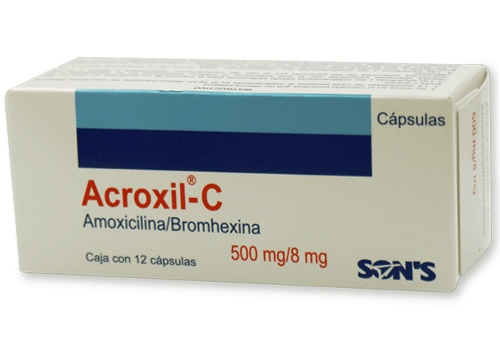 ACROXIL-C 500/8 mg cápsulas es una combinación farmacológica compuesta por amoxicilina, un antibiótico de amplio espectro de la familia de las penicilinas semisintéticas, y bromhexina, un agente mucolítico. Este medicamento está indicado para el tratamiento de infecciones de las vías respiratorias, especialmente en cuadros donde se requiere tanto la erradicación bacteriana como la fluidificación del moco, lo que facilita la expectoración y el alivio sintomático. Comúnmente se utiliza en infecciones como bronquitis, faringitis, amigdalitis, neumonía y otras afecciones del tracto respiratorio superior e inferior asociadas con producción excesiva de moco o esputo viscoso. El uso de ACROXIL-C requiere valoración y seguimiento médico profesional para garantizar la seguridad y eficacia del tratamiento y evitar el desarrollo de resistencia bacteriana.