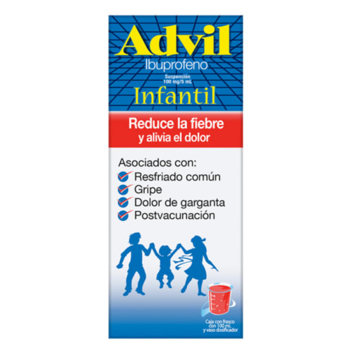 Advil Infantil Suspensión 100 ml, cuyo principio activo es el ibuprofeno, es un medicamento de la categoría de analgésicos indicado para el alivio del dolor leve a moderado y para la reducción de la fiebre. Se utiliza en el manejo sintomático de distintos cuadros dolorosos, como cefalea, migraña, odontalgia, dolor muscular, así como en casos de inflamación asociada a procesos infecciosos de las vías respiratorias superiores e inferiores. Es coadyuvante en padecimientos que cursan con dolor y fiebre, como lesiones musculoesqueléticas incluyendo esguinces, distensiones, contracturas, procesos reumatológicos y osteoarticulares como osteoartrosis, dorsopatías y otras afecciones inflamatorias.
