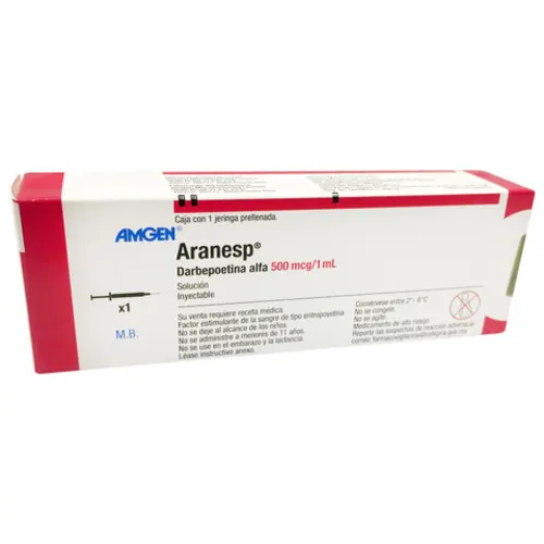 ARANESP® (darboepoetina alfa) es un medicamento biotecnológico utilizado para el tratamiento de la anemia secundaria asociada a insuficiencia renal crónica (IRC) en adultos y pacientes en tratamiento sustitutivo renal, ya sea que requieran diálisis o no. La darbepoetina alfa es una proteína similar a la eritropoyetina humana, diseñada para estimular la producción de glóbulos rojos cuando estos se encuentran disminuidos por insuficiencia renal, situación frecuente en pacientes con enfermedad renal crónica. Este medicamento se utiliza para aumentar o mantener los niveles de hemoglobina y reducir la necesidad de transfusiones sanguíneas derivadas de la anemia. Su empleo está respaldado por normativas y lineamientos nacionales e internacionales, bajo estricta supervisión médica. Consulta a tu médico antes de iniciar o modificar este tratamiento.
