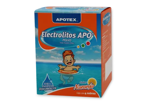 ELECTROLITOS APO Polvo Sabor Naranja es un suero oral formulado para el tratamiento de la deshidratación leve a moderada ocasionada principalmente por diarrea aguda. Contiene una combinación de ácido cítrico, glucosa, potasio y sodio, ingredientes clave para restablecer el equilibrio hidroeléctrico y reponer las pérdidas de agua y electrolitos esenciales. Su uso está indicado en pacientes adultos y adolescentes que requieren una rehidratación rápida y segura, especialmente en escenarios donde se presentan pérdidas significativas de líquidos y sales, ayudando a prevenir complicaciones asociadas a la deshidratación. Antes de usar este producto, consulta a tu médico para una valoración adecuada de la severidad y el manejo clínico.