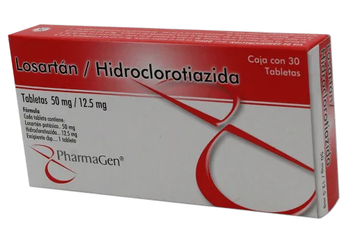Losartán Hidroclorotiazida 50/12.5 mg es un medicamento compuesto indicado para el tratamiento de la hipertensión arterial en adultos. Está formulado con dos ingredientes activos principales: losartán potásico, que pertenece a la clase de antagonistas de los receptores de angiotensina II (ARA II), e hidroclorotiazida, un diurético tiazídico. La combinación sinérgica de estos agentes permite controlar de manera efectiva la presión arterial en pacientes que no responden adecuadamente a la monoterapia. Está indicado especialmente en el manejo a largo plazo de la presión arterial elevada para reducir el riesgo de complicaciones cardiovasculares, tales como infarto de miocardio, accidente cerebrovascular e insuficiencia cardiaca. Este fármaco debe ser utilizado bajo estricta supervisión médica.