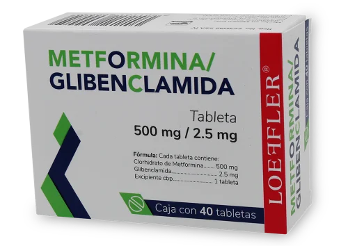 Metformina Glibenclamida 500/2.5 mg es un medicamento antidiabético oral con dos ingredientes activos: metformina clorhidrato y glibenclamida. Está indicado para el tratamiento de la diabetes mellitus tipo 2 en adultos, especialmente en aquellos casos en los que la monoterapia con metformina o una sulfonilurea (como la glibenclamida) no logra un control glucémico adecuado. Al actuar mediante mecanismos complementarios, este producto ayuda a disminuir los niveles elevados de glucosa en sangre, con el objetivo de prevenir complicaciones crónicas asociadas a la diabetes. El uso de este medicamento debe ser parte de un plan integral que incluya dieta, ejercicio y cambios en el estilo de vida bajo vigilancia médica. No debe emplearse para el tratamiento de la diabetes tipo 1 ni en situaciones de cetoacidosis diabética. El manejo farmacológico debe ser individualizado, y se requiere supervisión profesional para valorar riesgos y beneficios en cada paciente. Para evitar riesgos a la salud, consulte a su médico antes de iniciar este tratamiento.
