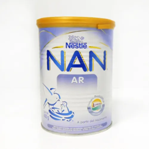 Nan AR. Es una fórmula especializada para lactantes con necesidades especiales de nutrición, indicada inmediatamente después del nacimiento. Presentación en lata con 400 g de polvo. Los ingredientes por cada 100 g de polvo son: 59.9 g de Hidratos de carbono, 39.2 de Lactosa, 12 g de Grasa monoinsaturada, 7.9 de Grasa saturada, 4.7 g de Grasa poliinsaturada, 4 100 mg de Ácido linoleico, 500 de Ácido α-linolénico, 0.12 g de Ácidos grasos trans, 12.8 mg de Colesterol, 9.8 g de Proteínas, 0.50 g de Fibra dietética, 200 mg de Sodio, 550 mg de Potasio, 381 mg de Cloruros, 353 mg de Calcio, 196 mg de Fósforo, 52 mg de Magnesio, 5.3 mg de Hierro, 5 mg de Zinc, 440 mcg de Cobre, 110 mcg de Manganeso, 77 mcg de Yodo, 20 mcg de Molibdeno, 20 mcg de Cromo, 18 mcg de Selenio, 69 mg de Vitamina C, 10 mg de Vitamina E, 5400 mcg de Niacina, 4800 mcg de Ácido pantoténico, 1150 mcg de Riboflavina, 510 mcg de Vitamina A, 500 mcg de Tiamina, 360 mcg de Piridoxina, 81 mcg de Ácido fólico, 44 mcg de Vitamina K1, 11.2 mcg de Biotina, 6.8 mcg de Vitamina D, 1.1 mcg de Cianocobalamina, 56 mg de Colina, 40 mg de Inositol, 32 mg de Taurina, 16 mg de Carnitina, 15 mg de Nucleótidos. Elaborado por Nestlé.