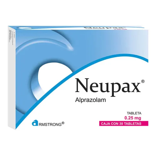 NEUPAX 0.25 mg Tableta contiene como principio activo alprazolam, una benzodiacepina indicada principalmente para el tratamiento de trastornos relacionados con la ansiedad, como el trastorno de ansiedad generalizada y los estados asociados a síntomas ansiosos intensos. También está autorizado para el tratamiento de los trastornos de ansiedad con manifestaciones depresivas y el manejo del trastorno de pánico. Su eficacia se debe a su acción tranquilizante, ansiolítica y relajante a nivel del sistema nervioso central. Debe administrarse bajo la supervisión de un profesional de la salud, ya que su uso requiere valoración clínica individualizada.