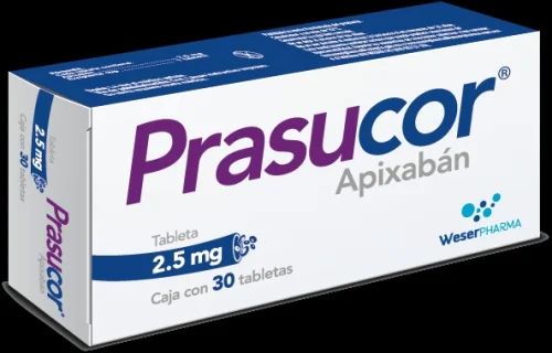PRASUCOR Apixabán 2.5 mg está indicado para la prevención de accidentes cerebrovasculares y embolias sistémicas en pacientes adultos con fibrilación auricular no valvular, un trastorno del ritmo cardíaco que incrementa el riesgo de formación de trombos y eventos tromboembólicos graves. El principio activo, apixabán, es un anticoagulante oral de acción directa que actúa como inhibidor selectivo del factor Xa. Su uso ayuda a reducir la probabilidad de formación de coágulos sanguíneos dentro de las cavidades cardíacas y su migración a vasos sanguíneos cerebrales o sistémicos. Este medicamento es de utilidad en pacientes en los que la terapia anticoagulante prolongada es recomendable para la protección frente a complicaciones tromboembólicas. El empleo de PRASUCOR debe ser supervisado y ajustado por un profesional de la salud para garantizar la seguridad y eficacia del tratamiento.