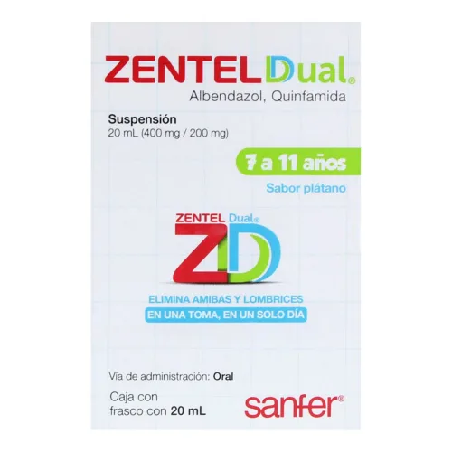 ZENTEL DUAL SUSPENSIÓN 400/200 MG 20 ML es una formulación antiparasitaria combinada que contiene como principios activos albendazol y quinfamida. Esta suspensión está indicada para el tratamiento de infecciones parasitarias intestinales mixtas o asociadas, especialmente aquellas causadas por helmintos y protozoarios. El albendazol es eficaz en el tratamiento de diversas helmintiasis, incluyendo infecciones por Ascaris lumbricoides, Trichuris trichiura, Ancylostoma duodenale, Necator americanus, Taenia spp., entre otros nematodos intestinales. Por su parte, la quinfamida está indicada principalmente contra protozoarios, especialmente Entamoeba histolytica en su forma trofozoítica. Esta combinación amplía el espectro de ZENTEL DUAL, permitiendo el abordaje terapéutico de infecciones parasitarias mixtas en un solo esquema. Su administración debe estar estrictamente supervisada por personal médico; consulta a tu médico antes de iniciar este tratamiento.