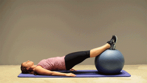 Colócate boca arriba con brazos y manos sobre el suelo con las palmas hacia abajo. Pon la pelota debajo de los pies a la altura de la pantorrilla. Haz una diagonal con tu cuerpo recto, comprime los glúteos y el abdomen aguantando la postura por 10 segundos. Afloja el cuerpo y repite el ejercicio por 10 veces.