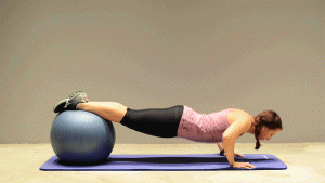 Con este ejercicio fortalecerás abdomen y brazos. Sube las piernas a la pelota mirando hacia el suelo y apoya las manos en el piso a la altura de los hombros. Baja el pecho hacia el suelo haciendo una lagartija sin doblar piernas y asegurándote que estén sobre la pelota. Puedes repetir este ejercicio 10 veces.