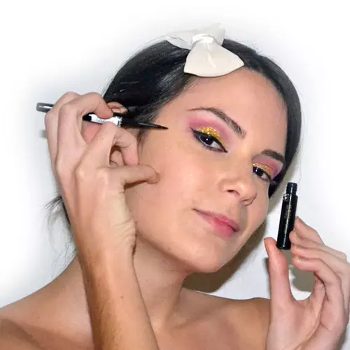 - Delineado dramático: Con delineador líquido se hace este tipo de maquillaje sobre el párpado pegado al nacimiento de las pestañas. El borde final es alargado y grueso pero todo el delineado de la parte de los ojos debe tener bordes finos. Puedes añadir destellos o brillos en el párpado. Tus labios pueden ir con un brillo metálico.