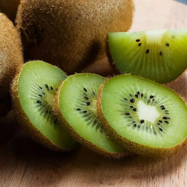 El kiwi aporta gran cantidad de fibra y pocas calorías. Es rico en vitamina C, vitamina E, y vitamina A, así como en potasio, calcio, cobre, magnesio y fibra. Además al contener fibra ayuda a regular el metabolismo mejorando la digestión.