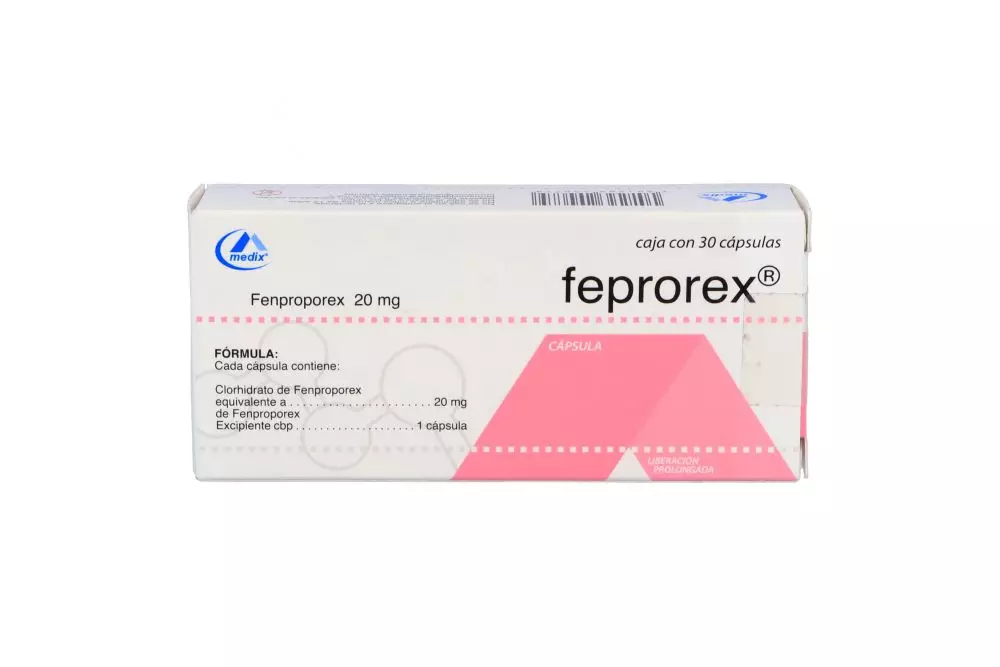 La caja de este medicamento contiene 30 cápsulas de 20 mg de clorhidrato de fenproporex.