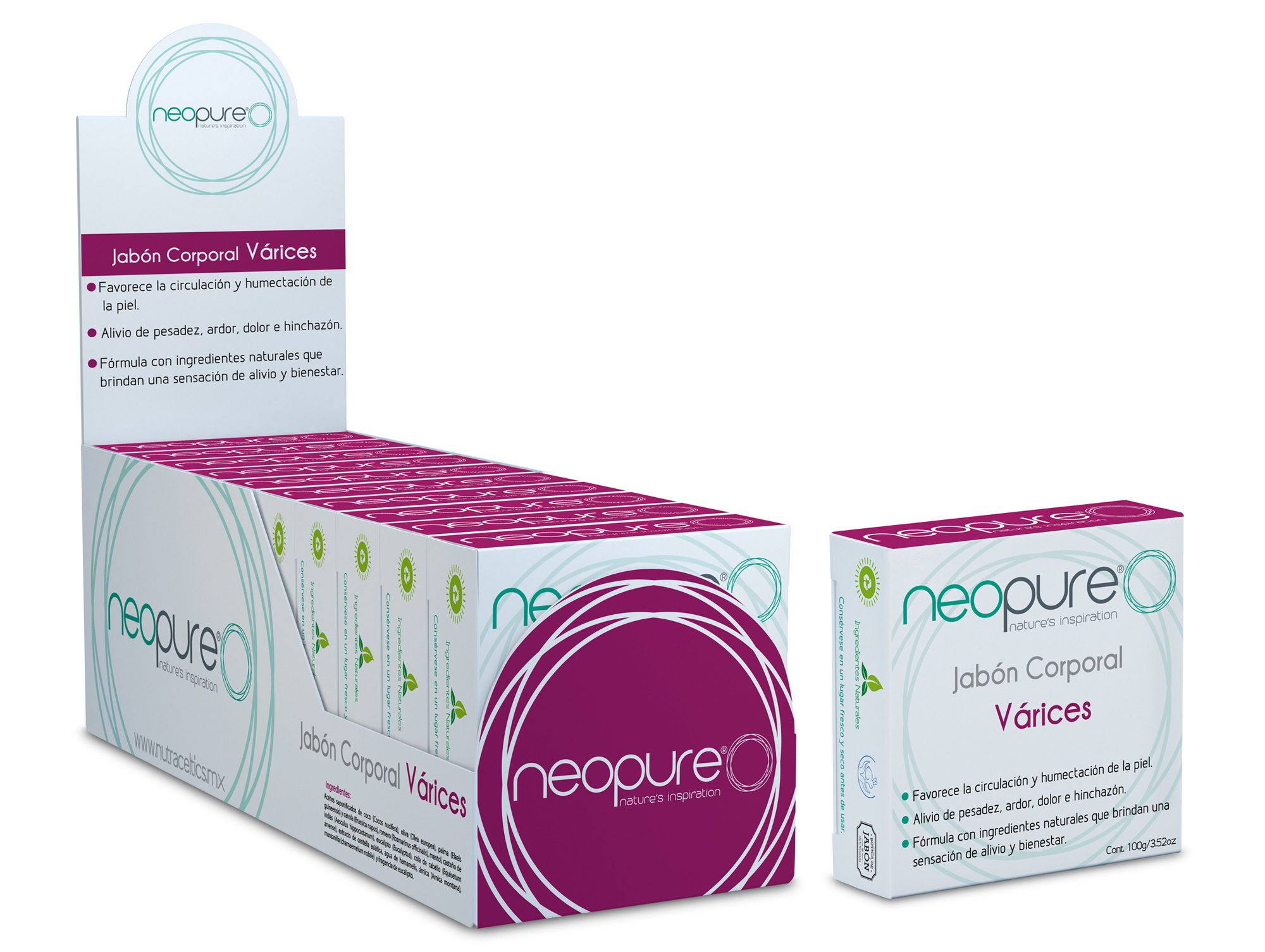 La presentación del Jabón Neopure Carbón activado es en cajas con 1 o 10 barras de jabón de 100 g.