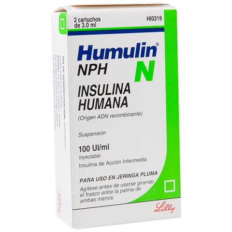 - Insulina de acción intermedia o NPH: Con duración de 10 a 12 horas y un tiempo de acción de 1 a 2 horas; puede encontrarse como Insulina NPH (caja color verde)