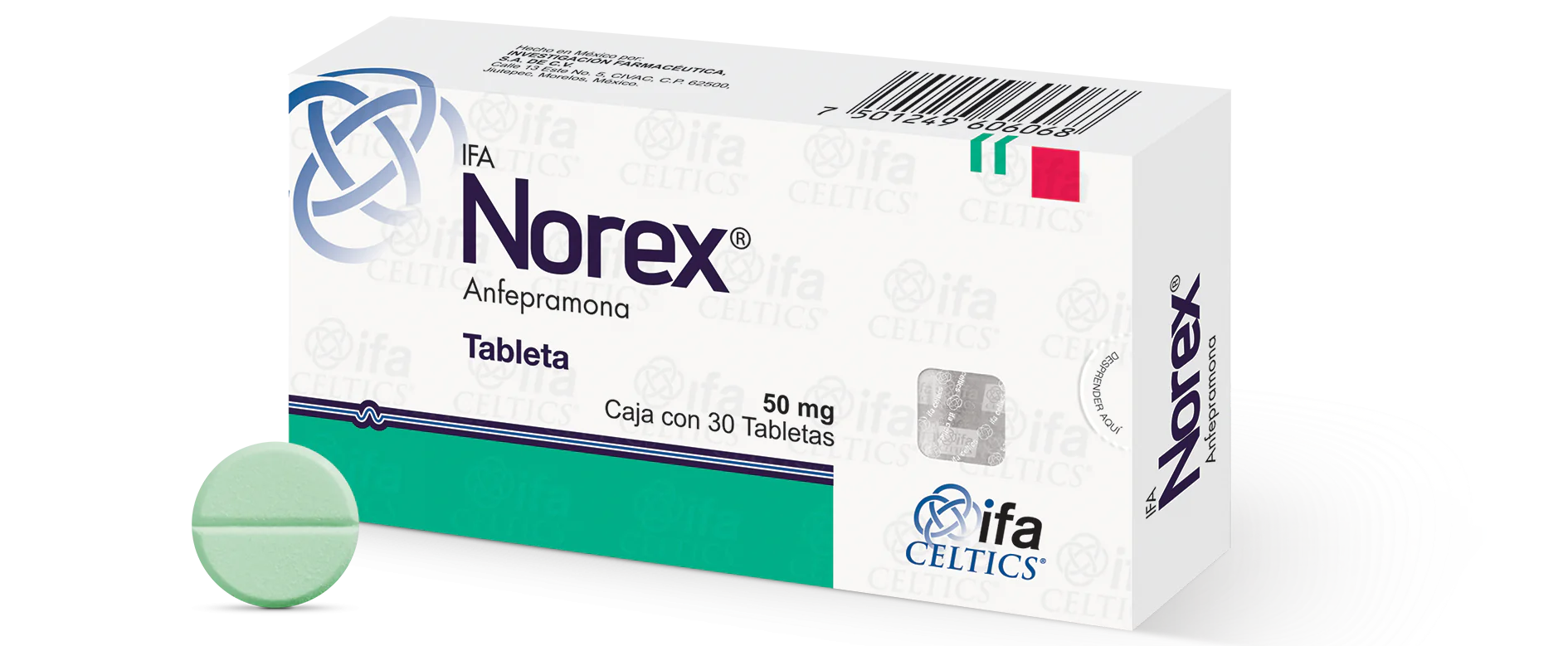 IFA Norex es un fármaco anorexigénico, compuesto por Anfepramona, indicado como auxiliar en el tratamiento de la obesidad exógena con un Índice de Masa Corporal (IMC) igual o superior a 30 kg/m2 o sobrepeso con alguna comorbilidad asociada como hipertensión arterial, diabetes mellitus tipo 2, apnea del sueño u osteoartritis.
