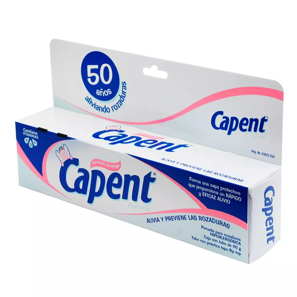 Capent es la marca de una pomada que ayuda a proteger la piel de los bebés de las rozaduras, proporcionando un rápido y eficaz alivio. Se encarga de formar una capa protectora que evita el contacto de la piel con agentes nocivos, además de calmar el dolor y la comezón. Leer más